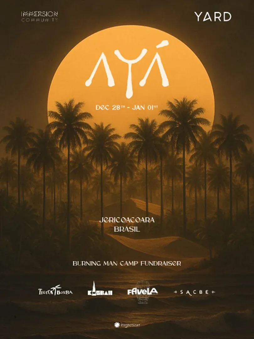 AYÁ Festival de Música e Artes é uma celebração colaborativa de Réveillon realizada em Jericoacoara, Brasil. A edição de 2025 reunirá comunidades internacionais de música, coletivos de arte, entusiastas de esportes de vento e a magia das dunas sob as estrelas.