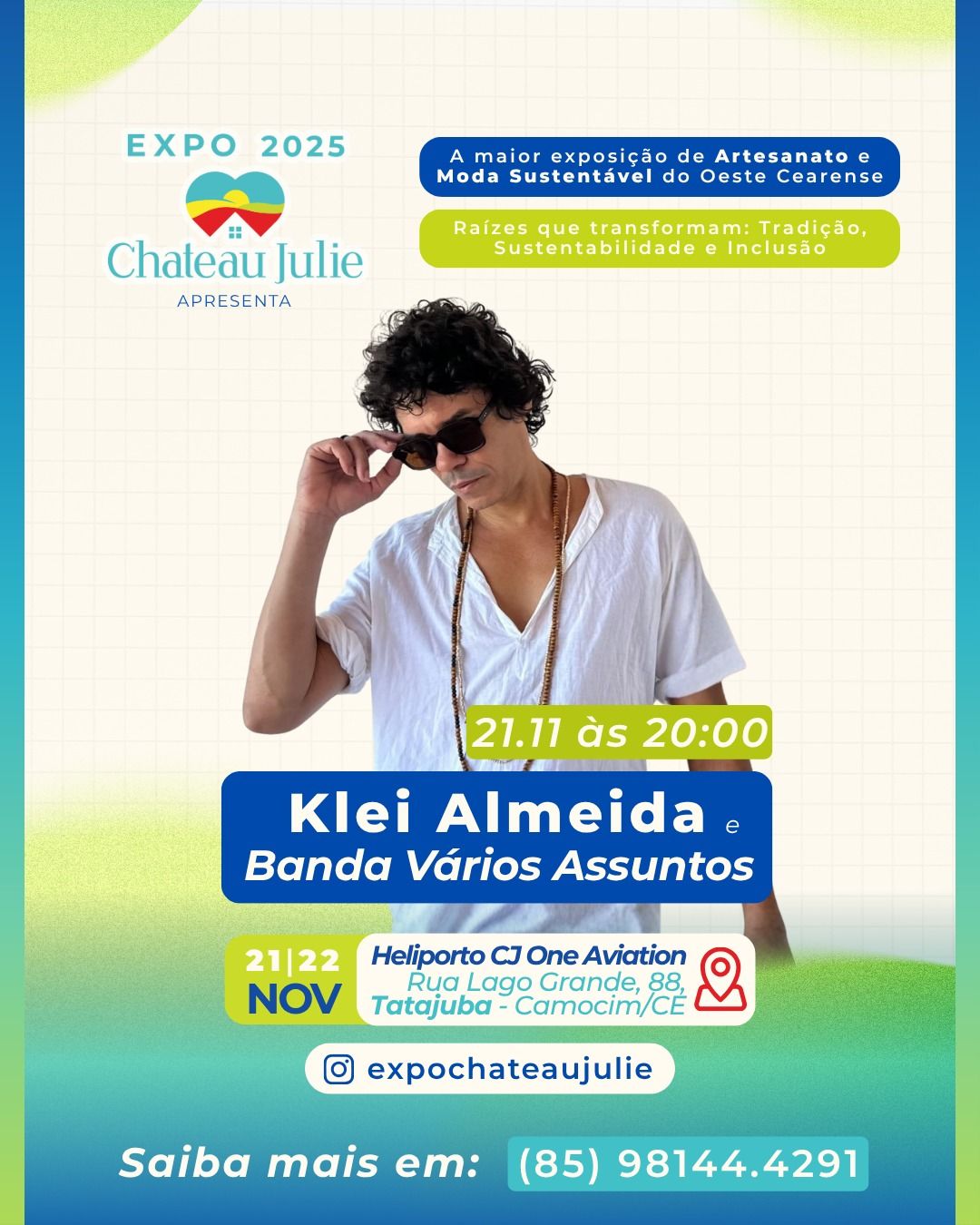 Energia, ritmo e identidade! O cantor e produtor Klei Almeida, acompanhado da Banda Vários Assuntos, é atração confirmada na EXPO Chateau Julie 2025! Conhecido na região de Preá e Jericoacoara, Klei traz uma mistura envolvente de música baiana e arranjos únicos, prometendo uma apresentação inesquecível.
