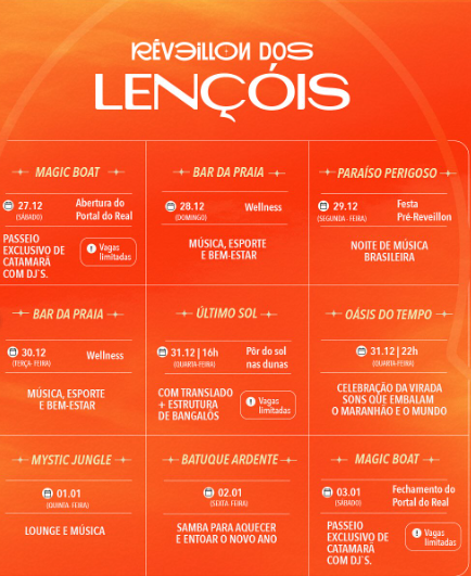 Nas dunas de areias brancas do deserto dos Lençóis maranhenses, o tempo é MÁGICO e o que importa é o AGORA. Durante oito dias (27/12 a 03/01), o Réveillon dos Lençóis propõe que o tempo deixe de ser meta e passe a ser presença. Que a gente viva essa experiência com a consciência que o agora é tudo o que existe. Às portas dos Lençóis, revela-se Atins: um portal de charme rústico, onde mar, rio e dunas se encontram. Destino internacional do kitesurf e do ecoturismo, une simplicidade e sofisticação em meio a uma paisagem única e uma energia contemplativa. Mais que um lugar, é um estilo de vida livre. É nesse cenário que nasce uma celebração que transcende o tempо. Através da música, esporte, wellness, responsabilidade social e ecológica, convidamos vocês a desfrutarem dessa experiência única, compartilhando sorrisos, abraços e momentos inesquecíveis, celebrando um novo ciclo no nosso patrimônio natural da humanidade!! NOSSA PROGRAMAÇÃO 27/12 13h30 - ABERTURA DO PORTAL - MAGIC BOAT - Passeio de catamarã com duração aproximada de 5 horas (a depender da maré) pelo Rio Preguiças, com vistas deslumbrantes do Farol de Mandacarú, Parque Éolico de Paulino Neves, parada para banho na praia de Caburé, além de encontros incríveis com a fauna e flora local. line up: FÉLIX