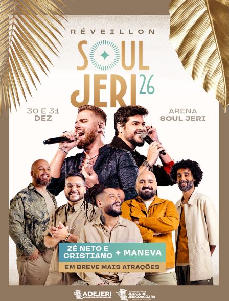 O paraíso já tem data marcada para a virada mais esperada do Ceará! Nos dias 30 e 31 de dezembro, a Arena Soul Jeri será palco de uma experiência inesquecível, com Zé Neto & Cristiano e Maneva comandando a energia da praia mais encantadora do Brasil! 🎶🔥